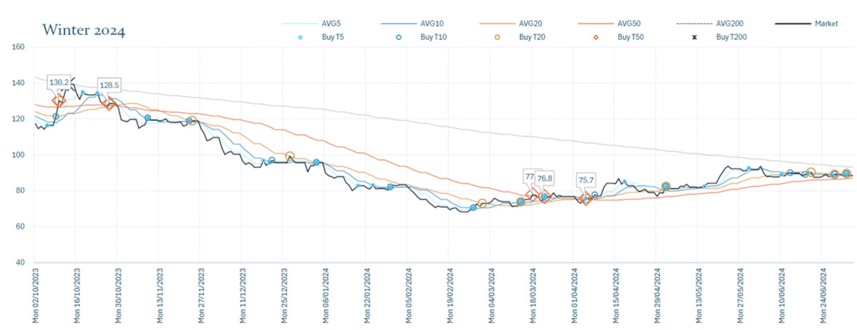 Our system generated alerts, created forty end-of-day crossover triggers. Crossover events occur when short-term trends go through longer-termed averages, suggesting a change in the trend`s direction. Taking the strongest pricing confluences we review the fundamentals at the crossover points and winter prices available at that time.